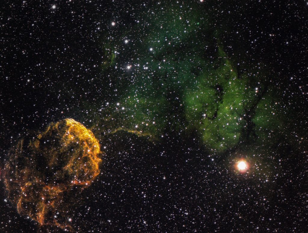 The data was sourced form “astrobackyard”. SHO filters were the original data. I contrast and brightness corrected (or massaged) the data and assigned a false colour based of SHO -> RGB scheme.