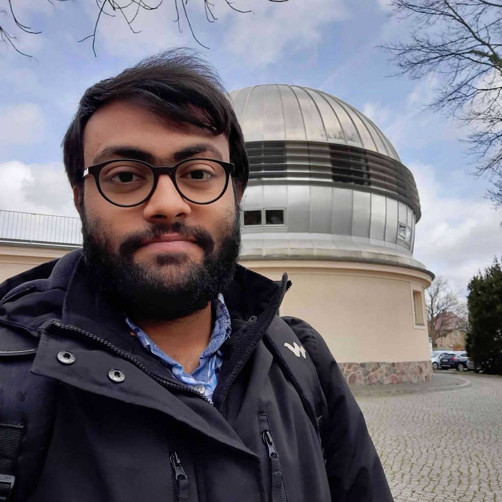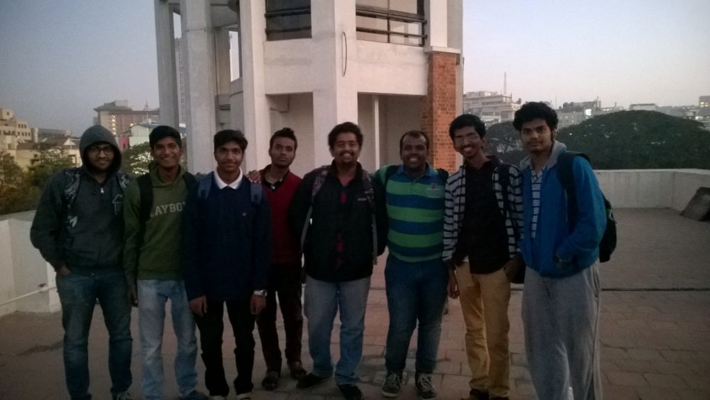 Group photo in front of telescope dome at the St. Joseph University, Bangalore. The year is probably 2015. The dome houses a Messer 8″ Schmidt-Cassegrain which can be used with a Messer monochrome ccd with colour filters for images.Photo description (right to left): Desmond, Satish, Balaji, (unknown), Vishal, (unknown), Govardhan, (unknown)